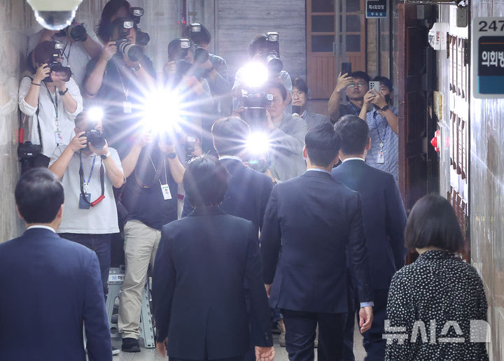[서울=뉴시스] 김명년 기자 = 정청래 더불어민주당 대표 등 지도부가 11일 오후 서울 여의도 국회에서 의원총회 참석을 위해 이동하고 있다. 2025.09.11. kmn@newsis.com |