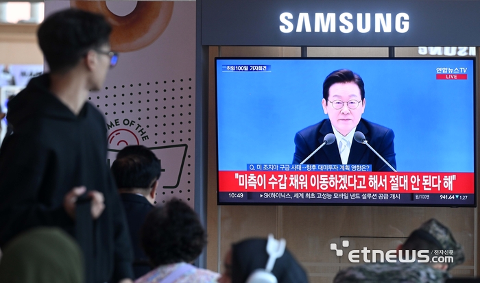 이재명 대통령 취임 100일 기자회견이 열린 11일 서울역 대합실에서 시민들이 기자회견 생중계를 지켜보고 있다. 김민수기자 mskim@etnews.com |