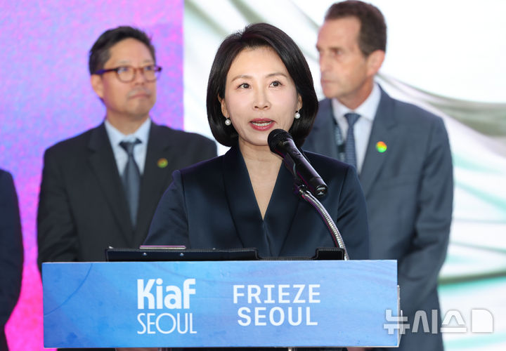 [서울=뉴시스] 황준선 기자 = 이재명 대통령 부인 김혜경 여사가 지난 3일 서울 강남구 코엑스에서 열린 국내최대 아트페어 '키아프 서울(Kiaf SEOUL)'과 세계 3대 아트페어 '프리즈 서울(FRIEZE SEOUL)' 개막식에 참석해 축사를 하고 있다. 2025.09.03. hwang@newsis.com |
