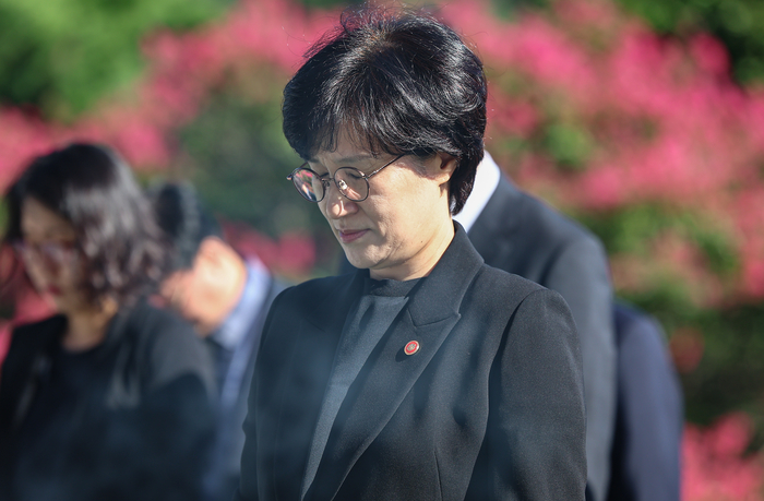 원민경 여성가족부 장관이 11일 서울 동작구 국립서울현충원을 찾아 현충탑에 묵념을 하고 있다. 뉴스1 |