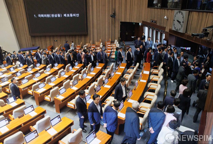[서울=뉴스핌] 윤창빈 기자 = 11일 오후 서울 여의도 국회에서 열린 본회의에서 권성동 국민의힘 의원 체포동의안 표결이 시작되자 국민의힘 의원들이 회의장을 나서고 있다. 2025.09.11 pangbin@newspim.com |