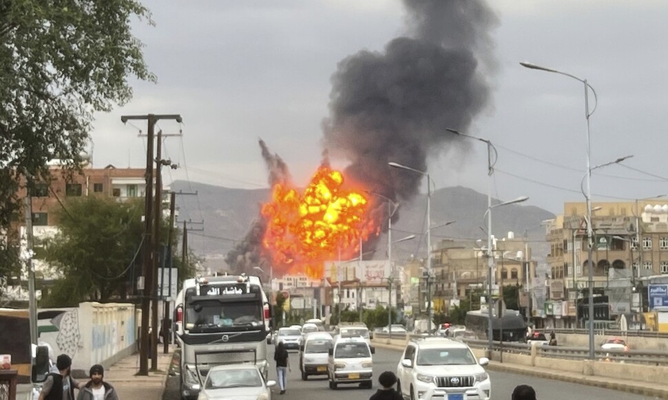 10일(현지시각) 예멘의 수도 사나에서 이스라엘의 공습으로 화염과 연기가 솟구치고 있다. AP 연합뉴스 |