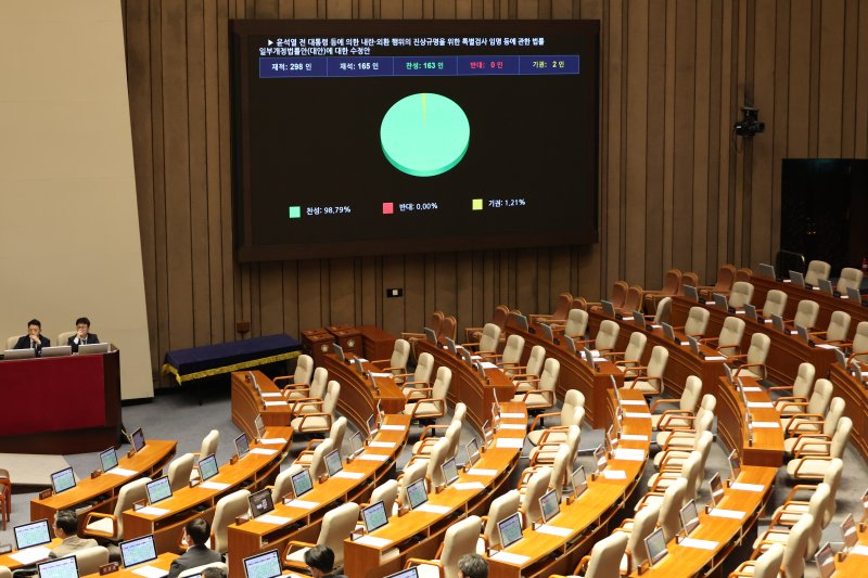 11일 국회 본회의에서 '윤석열 전 대통령 등에 의한 내란·외환 행위의 진상규명을 위한 특별검사 임명 등에 관한 법률 일부개정법률안'에 대한 수정안이 여당 주도로 통과되고 있다. 연합뉴스 |