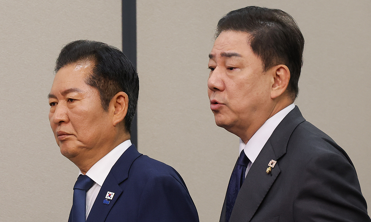 더불어민주당 정청래 대표(왼쪽)와 김병기 원내대표가 지난 10일 서울 여의도 국회에서 열린 최고위원회의에 입장하고 있다. 연합뉴스 |