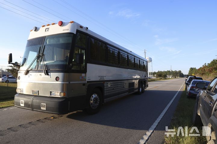[포크스턴=AP/뉴시스] 10일(현지 시간) 미국 조지아주 포크스턴 이민세관단속국(ICE) 구금 시설에서 버스 한 대가 이동하고 있다. 정부에 따르면 11일 정오 한국인 316명 등 총 330명이 전세기에 탑승해 귀국할 예정이다. 2025.09.11. |