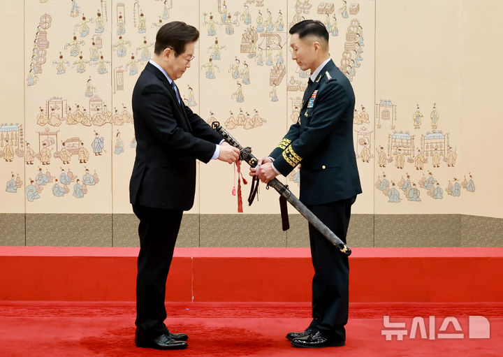 [서울=뉴시스] 최동준 기자 = 이재명 대통령이 2일 서울 용산 대통령실 청사에서 열린 대장 진급·보직 신고 및 삼정검 수치 수여식에서 김성민 한미연합사 부사령관의 삼정검에 수치를 달아주고 있다. (대통령실통신사진기자단) 2025.09.02. photocdj@newsis.com |