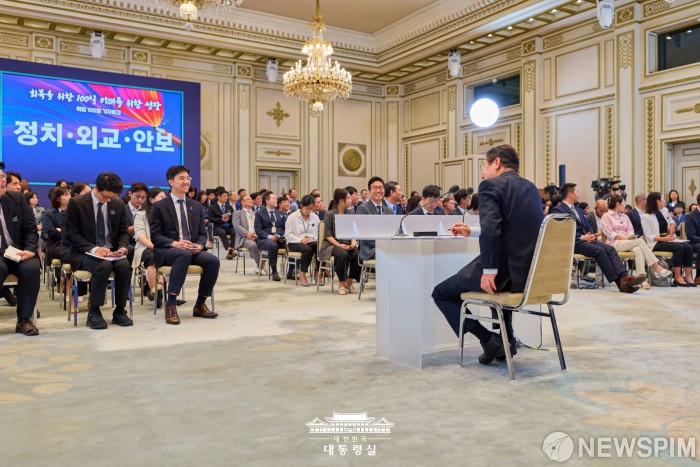 [서울=뉴스핌] 이재명 대통령이 11일 서울 종로구 청와대 영빈관에서 취임 100일 기자회견을 열고 있다. [사진=대통령실] 2025.09.11 photo@newspim.com