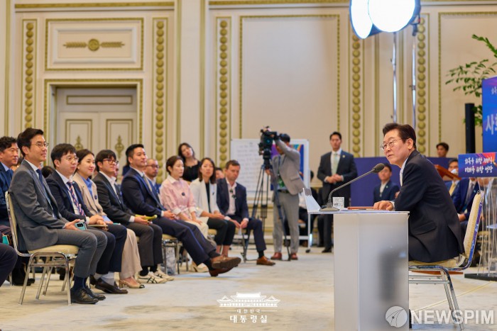 [서울=뉴스핌] 이재명 대통령이 11일 서울 종로구 청와대 영빈관에서 취임 100일 기자회견을 열고 있다. [사진=대통령실] 2025.09.11 photo@newspim.com
