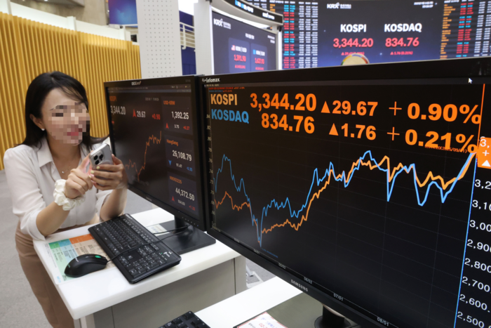 코스피 지수가 종가 기준 최고치를 경신하며 마감한 11일 오후 서울 여의도 한국거래소 모니터에 전 거래일보다 29.67포인트(0.90%)상승한 3344.20을 나타내고 있다. [사진 = 뉴스1] |