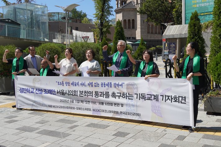 교회협은 오늘(11일) 긴급기자회견을 열고 "성진학교 설립은 장애를 가진 아이들이 마땅이 누려야 할 배움의 권리를 보장하고, 매일 수십 킬로미터를 이동해야 하는 고통스러운 통학현실을 끝내는 최소한의 사회적 책무"라며 "지역사회의 이해관계에 밀려 지체되는 현실은 우리 사회의 부끄러운 자화상"이라고 말했습니다.