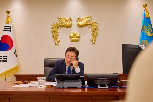 이재명 대통령이 4일 용산 대통령실에서 오흐나 후렐수흐 몽골 대통령과 전화 통화를 하고 있다. [사진=연합뉴스] |