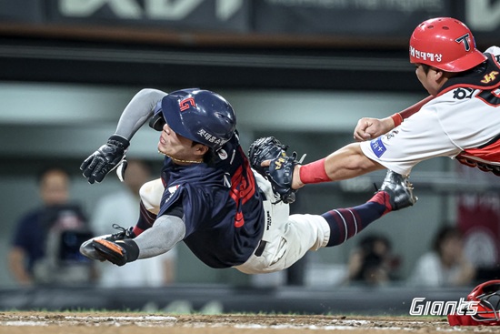 롯데는 8회초 1사 뒤 박찬형과 전민재의 연속 안타로 1사 1, 3루 추가 득점 기회를 만들었다. 3루에 대주자 김동혁이 위치한 가운데 후속타자 장두성의 포수 앞 땅볼이 나왔다. 김동혁이 과감하게 홈을 파고들었지만, 곧바로 공을 집어 들어 태그를 시도한 상대 포수 김태군의 플레이에 아웃 선언을 받았다.