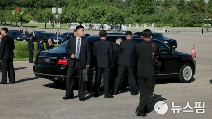 [서울=뉴스핌] 이영종 통일전문기자 = 김정은 북한 국무위원장을 태운 차량이 지난 9일 평양 만수대의사당에 들어서고 있다. 뒤편으로 경호요원을 태운 차량이 보인다. [사진=조선중앙TV 화면 캡처] 2025.09.12 yjlee@newspim.com |