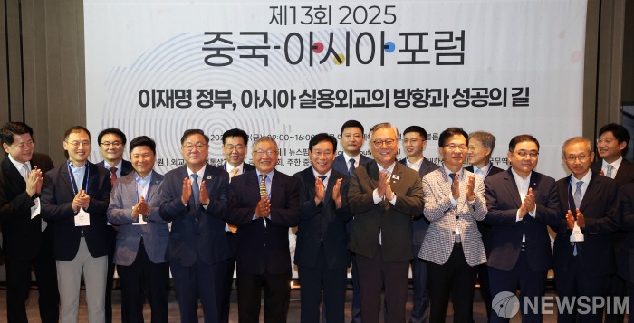 [서울=뉴스핌] 정일구 기자 = 민병복 뉴스핌 회장과 김태년 한중의원연맹회장 등 내빈들이 12일 오전 서울 여의도 페어몬트호텔 그랜드볼룸에서 종합뉴스통신사 뉴스핌 주최로 열린 제13회 2025 중국·아시아 포럼에서 기념촬영을 하고 있다. '이재명 정부, 아시아 실용외교의 방향과 성공의 길'을 주제로 열린 이번 포럼은 중국, 일본, 인도, 베트남 등 아시아 국가들과의 경제·문화 협력 상황을 점검하고 발전 방안을 찾기 위해 마련됐다. 2025.09.12 mironj19@newspim.com