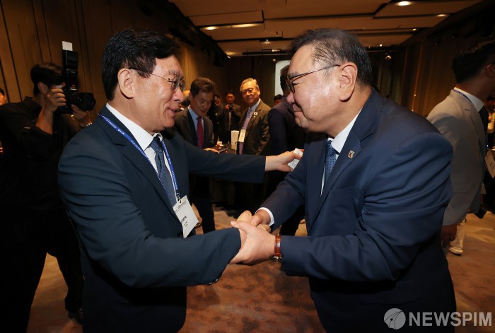[서울=뉴스핌] 정일구 기자 = 민병복 뉴스핌 회장(왼쪽)과 김태년 한중의원연맹회장이 12일 오전 서울 여의도 페어몬트호텔 그랜드볼룸에서 종합뉴스통신사 뉴스핌 주최로 열린 제13회 2025 중국·아시아 포럼에서 인사를 나누고 있다. '이재명 정부, 아시아 실용외교의 방향과 성공의 길'을 주제로 열린 이번 포럼은 중국, 일본, 인도, 베트남 등 아시아 국가들과의 경제·문화 협력 상황을 점검하고 발전 방안을 찾기 위해 마련됐다. 2025.09.12 mironj19@newspim.com