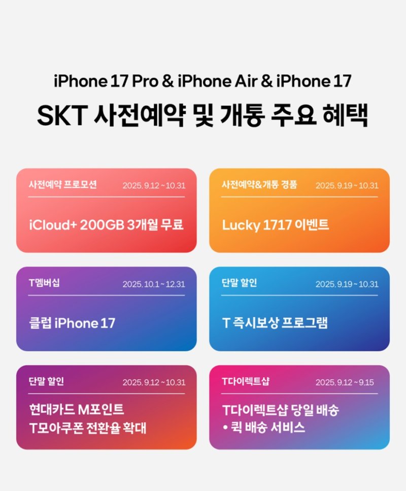 또 이 기간 중 아이폰 신제품을 구입하고 개통한 SK텔레콤 고객을 위한 차별화된 T멤버십 혜택 ‘클럽 아이폰 17’도 마련했다. 10월 31일까지 개통한 고객들에게 12월 말까지 특별한 혜택이 제공된다.