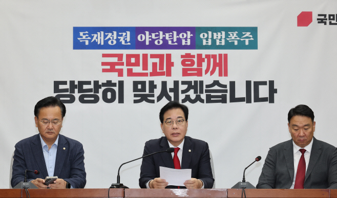 정희용 사무총장은 "취임 100일 동안 협치는 자취를 감췄고, 여당 내부는 권력투쟁에 매몰됐다"며 "당대표와 원내대표의 집안싸움 끝에 나라는 또다시 특검 정국으로 끌려가고 있다"고 비판했다.