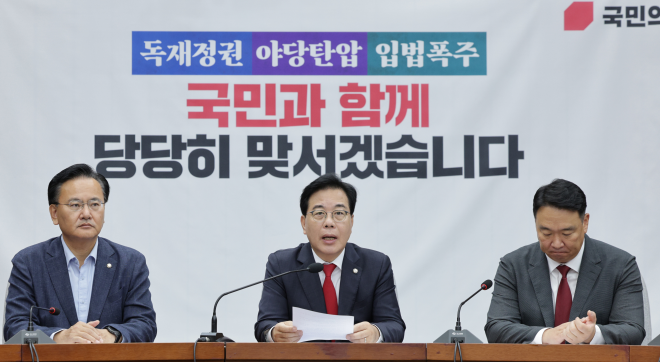 합의 파기 과정에서 발생한 민주당 ‘투톱’ 충돌에 대해서는 “그 과정에서 정청래 민주당 대표가 같은 당 김병기 원내대표에게 책임을 뒤집어 씌우려 했다”고 지적했다. 이 대통령에 대해선 “합의안 몰랐다는 새빨간 거짓말을 태연하게 기자회견장에서 늘어놨다”고 했다.