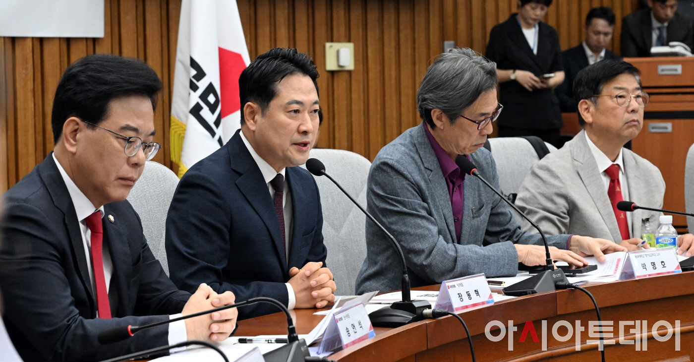아시아투데이 송의주 기자 = 장동혁 국민의힘 대표(왼쪽에서 두번째)가 12일 국회에서 열린 '이재명 정부 100일 국정 파탄 실정 토론회'에서 발언을 하고 있다.