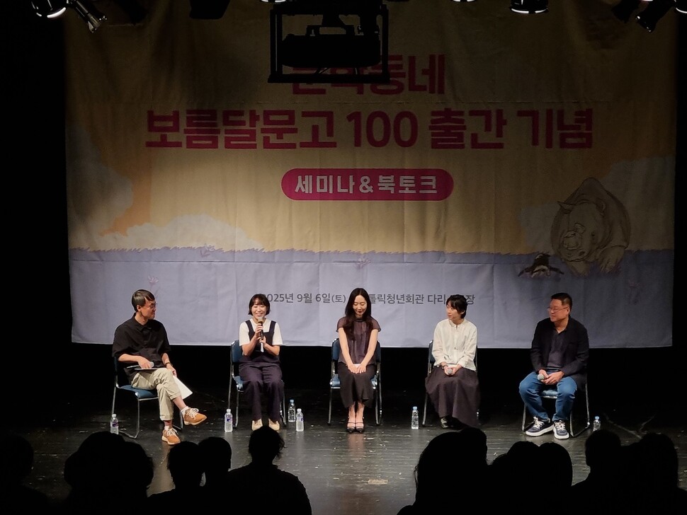 지난 6일 서울 마포구 동교동 다리소극장에서 보름달문고 100권 발간을 맞이해 북토크가 진행됐다. 왼쪽부터 유영진 아동문학평론가, 루리 작가, 은소홀 작가, 김지완 작가, 한윤섭 작가. |
