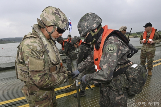 (여주=뉴스1) 김영운 기자 = 27일 경기 여주시 남한강 일대 훈련장에서 실시한 '한미연합 제병협동 도하훈련'에서 육군 제7공병여단 장병들과 미2사단/한미연합사단 장병들이 교절을 연결하고 있다. (공동취재) 2025.8.27/뉴스1 Copyright (C) 뉴스1. All rights reserved. 무단 전재 및 재배포, AI학습 이용 금지. |