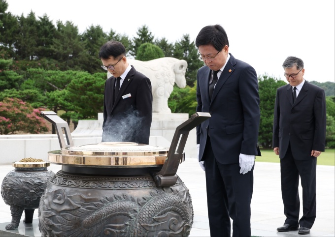 최교진(왼쪽에서 두 번째) 교육부 장관이 12일 취임식에 앞서 현충원에서 참배하고 있다. [사진=교육부] |