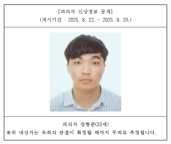 검찰은 신상정보공개심의위원회를 열어 지난달 22일 장형준의 신상 공개를 결정했다.