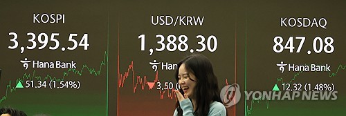 이날 코스피 지수는 사상 최고치를 3거래일 연속 경신했다. 전날보다 51.34포인트 오른 3,395.54로 거래를 마쳤다.