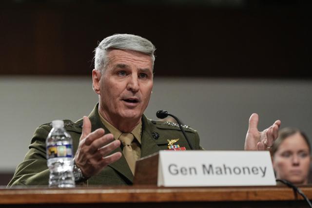 크리스토퍼 마호니 미군 합동참모본부 차장 후보자가 11일 미국 워싱턴 연방의회에서 상원 군사위원회 인사 청문회에 출석해 질문에 답변하고 있다. 워싱턴=AP 연합뉴스 |