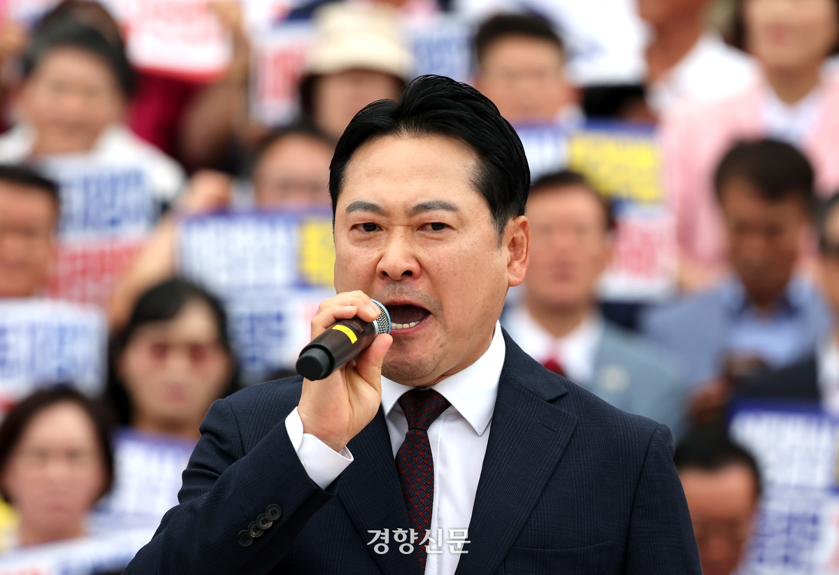 장동혁 국민의힘 대표가 12일 국회 본관앞 계단에서 열린 야당탄압 독재정치 규탄대회에서 발언하고 있다. 박민규 선임기자 |