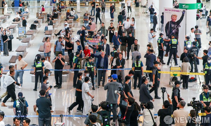 [영종도=뉴스핌] 김학선 기자 = 미국 이민당국에 의해 조지아주에 구금됐던 한국인 300여 명이 12일 오후 인천국제공항 제2여객터미널 입국장으로 입국하고 있다. 2025.09.12 yooksa@newspim.com