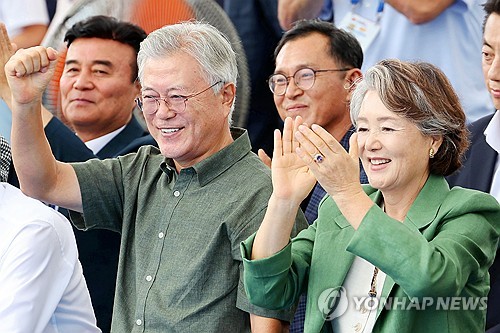문 전 대통령 부부는 경기 전 관람객들의 환호에 머리 위로 손을 흔들어 화답하고 '손하트'를 만들어 보이기도 했다.