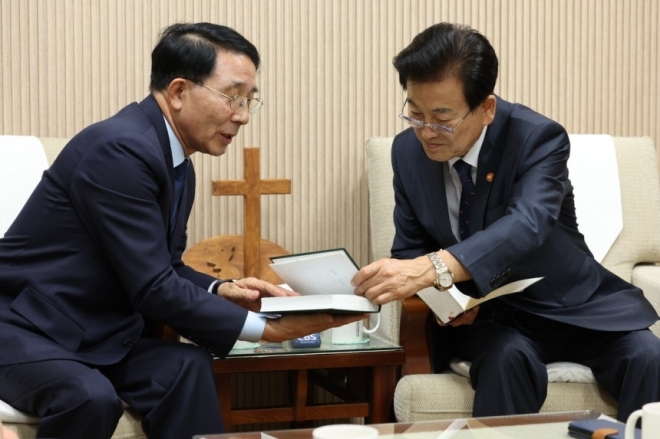정동영(오른쪽) 통일부 장관이 12일 서울 종로구 한국기독교회관에서 한국기독교교회협의회(NCCK) 총무인 김종생 목사를 예방했다. 2025.9.12 통일부 제공 |