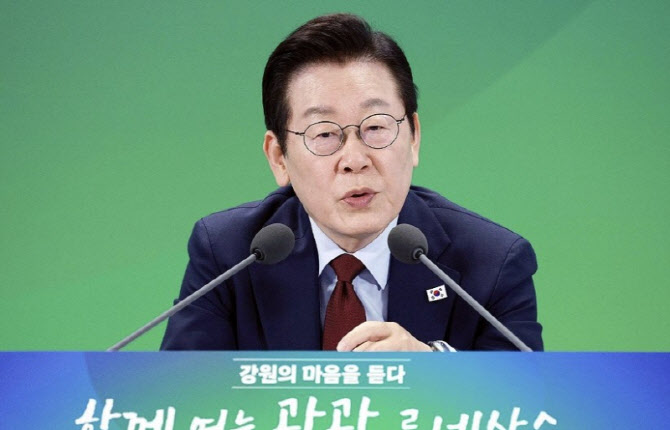 이재명 대통령이 12일 강원도 춘천시 강원창작개발센터에서 열린 지역 토론회 강원의 마음을 듣다 타운홀 미팅에서 질문에 답변하고 있는 모습. (사진=연합뉴스) |