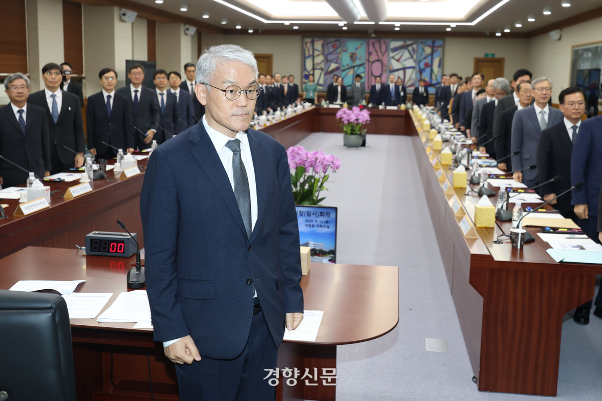 천대엽 법원행처장과 전국 각급 법원장들이 12일 서울 서초구 대법원에서 열린 전국법원장회의 임시회의에 참석하고 있다. 한수빈 기자 |
