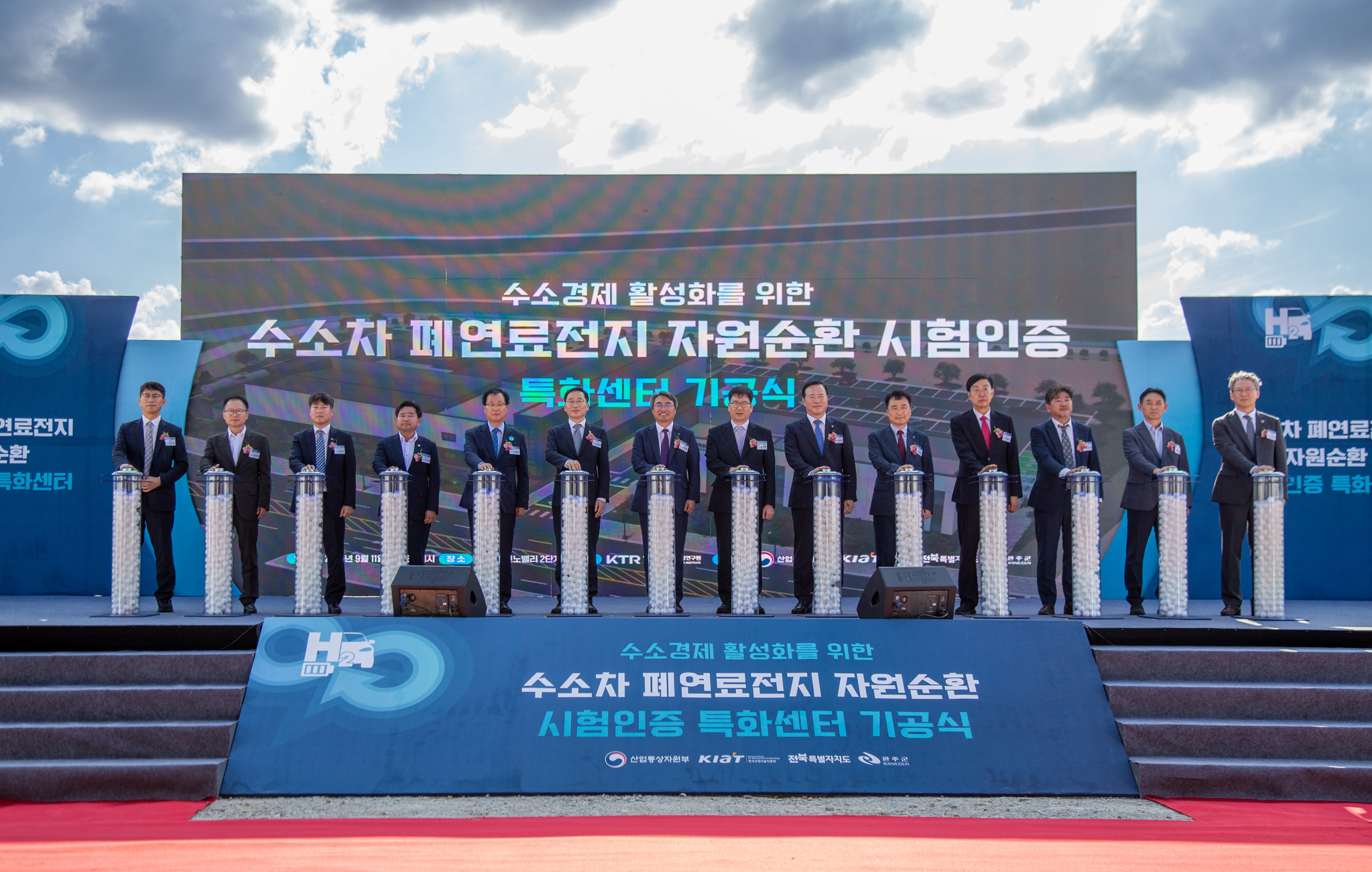 KTR은 11일, 전북 완주 테크노밸리 2단지(제내리 1243)에서 ‘수소경제 활성화를 위한 수소차 폐연료전지 자원순환 시험인증 특화센터’ 기공식을 개최하고 수소 자원순환 생태계 조성에 본격 나섰다.