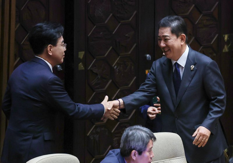 송언석 국민의힘 원내대표가 지난 10일 서울 여의도 국회에서 열린 제249회국회(정기회) 제3차 본회의에서 교섭단체 대표연설을 하기 위해 이동하던 중 김병기 더불어민주당 원내대표와 악수하고 있다. 뉴시스 |