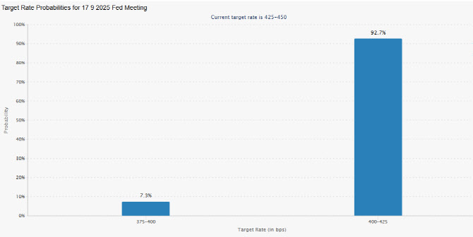 연준이 정책금리를 3.75~4.0%로 0.5%p 낮추는 ‘빅컷’을 단행할 확률도 7.3%로 예상됐다. 이는 모든 투자자가 ‘정책금리 인하는 확실하다’고 보고 있음을 뜻한다.
