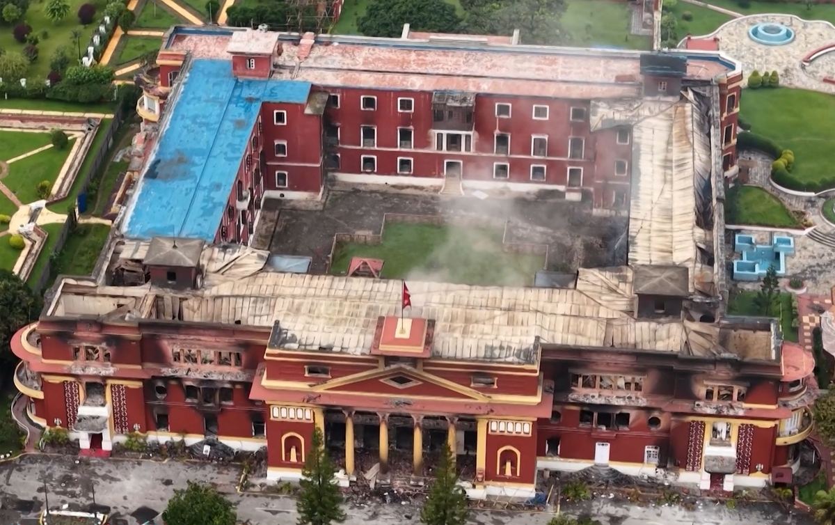 지난 10일(현지시간) 네팔 카트만두에 있는 대통령궁이 전날 시위대의 방화로 불탄 뒤 연기가 솟아오르고 있다. AFP연합뉴스 |