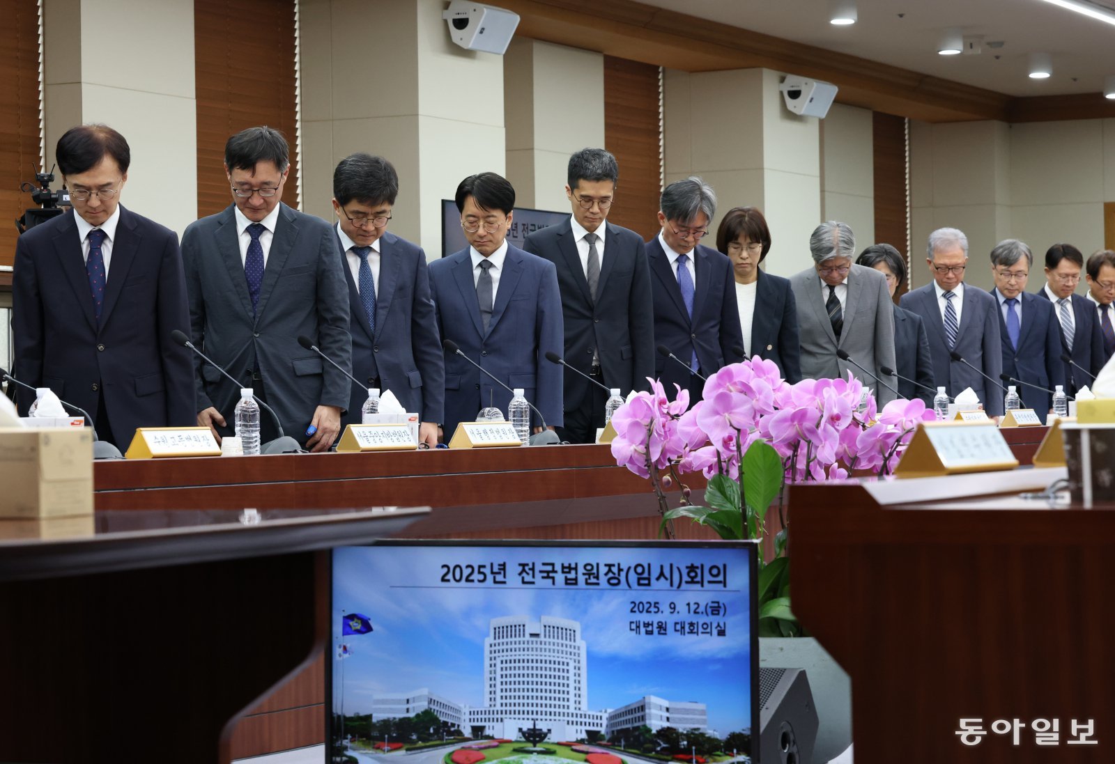 정부와 여당이 사법개혁 법안 처리에 속도를 내는 가운데 12일 오후 서울 서초구 대법원에서 열린 전국 법원장회의 임시회의에 전국에서 모인 법원장들이 국민의례를 하고 있다. 변영욱 기자 cut@donga.com |