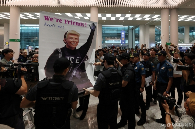 미국 이민당국에 의해 조지아주에 구금됐던 한국인 근로자들이 귀국한 12일 인천국제공항 제2여객터미널 입국장에서 공항경찰대가 도널드 트럼프 미국대통령 얼굴 배너를 든 시민단체의 시위를 저지하고 있다. (공동취재) /사진=뉴시스 |