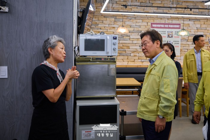 [서울=뉴스핌] 이재명 대통령이 지난 30일 강원 강릉시 경포대 인근 음식점을 찾아 가뭄으로 인한 피해 상황을 청취하고 있다. [사진=대통령실] 2025.09.01 photo@newspim.com |
