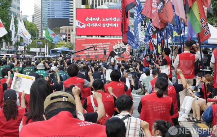 [서울=뉴스핌] 양윤모 기자 = 13일 오후 민주노총이 서울 중구 지하철 시청역 7번 출구 일대에서 양경수 위원장과 조합원 5천명이 참석한 가운데 '9·13 민주노총 결의대회'를 개최했다. 민노총은 특수고용·플랫폼 노동자 보호 입법 보완을 요구하고, 노정교섭 제도 구축과 회계공시·타임오프제 폐지를 촉구했다. 또한 미국 트럼프 정부의 대한민국 노동자 불법 체포 및 경제 수탈 정책을 규탄했다. 2025.09.13 yym58@newspim.com |