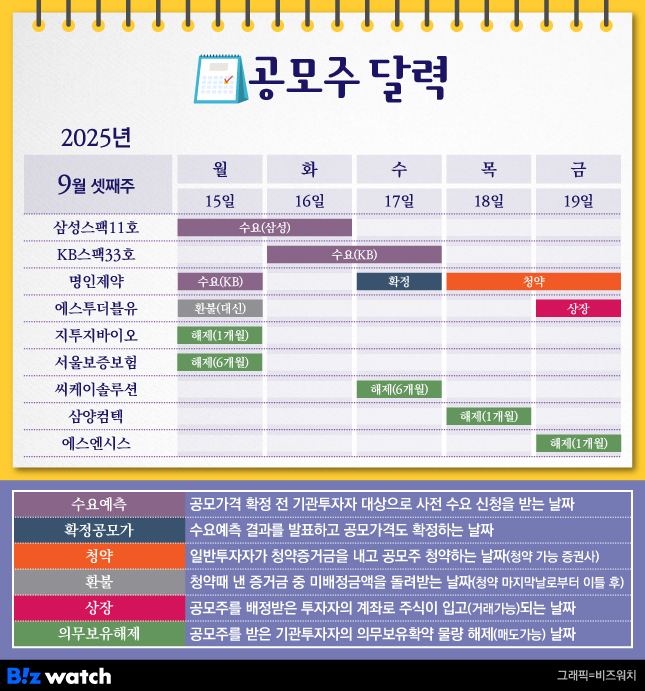 이 밖에도 삼성스팩11호와 KB스팩33호가 각각 15, 16일에 수요예측을 시작해요.