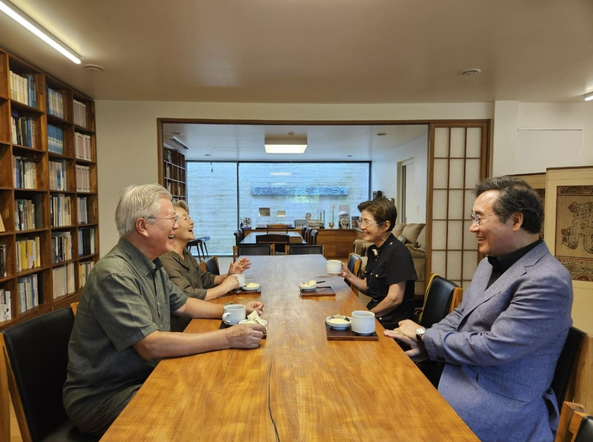 글과 함께 공개된 사진에는 문 전 대통령 부부와 마주 앉아 활짝 웃는 이 고문 부부의 모습이 담겼다. 사진 속 문 전 대통령은 이 고문 앞에서 그야말로 ‘파안대소’격의 표정인데, 옆에 앉은 문 전 대통령의 부인 김정숙 여사도 즐거운 듯한 모습이 눈에 띈다.