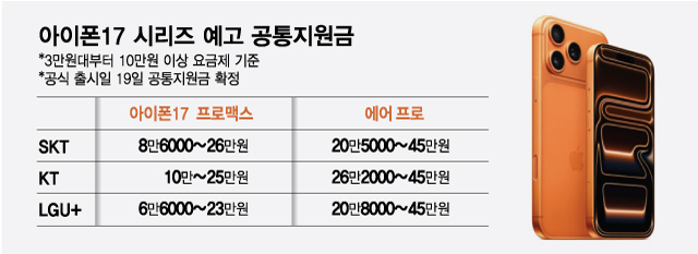 14일 업계에 따르면 이통 3사는 아이폰17 시리즈의 예고 공통지원금을 공시했다. 아이폰17·프로맥스와 에어·프로 모델의 지원금은 각각 다르게 책정했다. 모델별로는 아이폰17·프로맥스가 6만6000~26만원, 아이폰17 에어·프로 모델이 20만5000~45만원이다. 공통지원금은 아이폰17 출시일인 19일 확정되며 그전에 변경될 수 있다.