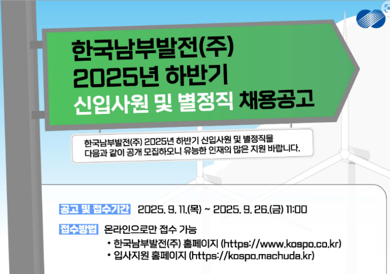 한국남부발전이 2025년 하반기 신입사원 및 별정직 94명을 공개 채용한다. 채용 규모는 대졸 수준 81명, 고졸 10명, 별정직 3명이다. 지원서는 9월 11일부터 26일까지 접수하며, 서류·필기·면접 전형을 거쳐 12월 중 최종 합격자를 발표할 예정이다.
