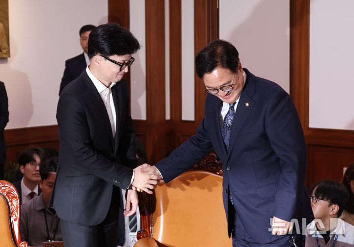 [서울=뉴시스] 고승민 기자 = 한동훈 전 국민의힘 대표가 지난해 9월 30일 서울 여의도 국회에서 우원식 의장을 예방, 악수하고 있다. 2024.09.30. kkssmm99@newsis.com |