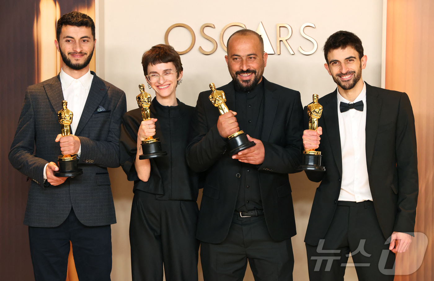 '노 어더 랜드'의 공동 감독 바젤 아드라, 레이첼 소르, 함단 발랄, 유발 아브라함이 3월 2일(현지시간) 캘리포니아 로스엔젤레스 할리우드에서 열린 제97회 아카데미 시상식에서 트로피를 들어 보이고 있다. ⓒ 로이터=뉴스1 ⓒ News1 윤다정 기자 |