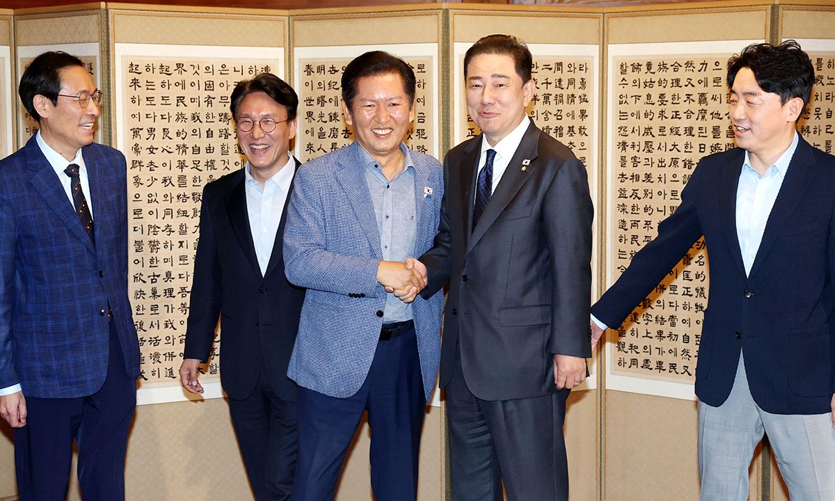 앙금 풀렸을까 더불어민주당 정청래 대표와 김병기 원내대표가 14일 오후 서울 종로구 삼청동 총리 공관에서 열린 당정대 고위급 만찬회동에서 기념촬영 후 악수를 하며 웃고 있다. 왼쪽부터 우상호 대통령실 정무수석, 김민석 국무총리, 정 대표, 김 원내대표, 강훈식 대통령 비서실장. 이제원 선임기자 |